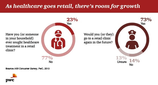 Twenty-three percent of respondents sought healthcare treatment in a retail clinic, and 73 percent of them would use that service again, according to an informational graphic (pictured right) provided by PwC's Health Research Institute. The number of people using retail clinics tripled from 2007, when just 9.7 percent used that service, according to another HRI survey of more than 1,000 consumers.